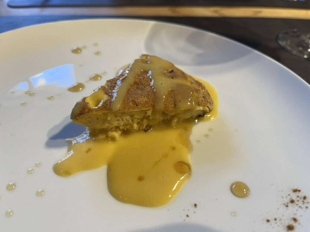 Dessert featured a pineapple pancake, flavoured with cinnamon, made using pineapple grown locally in Beppu, cultivated in greenhouses warmed naturally by the onsen (hot spring) steam, an unexpected characteristic of Oita's agriculture.