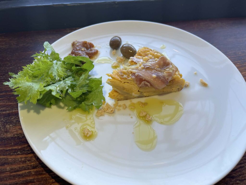 Highlights included a Spanish omelette with garlic, topped with cheese made from cow’s milk but fermented using white mould, creating a sheep’s milk taste, finished with inoshishi (wild Japanese boar) pancetta cured for three months, and a side of wasabi leaves.